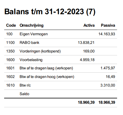 | 1100 | Lopende rekening RABO-bank | 7.143,07 | |