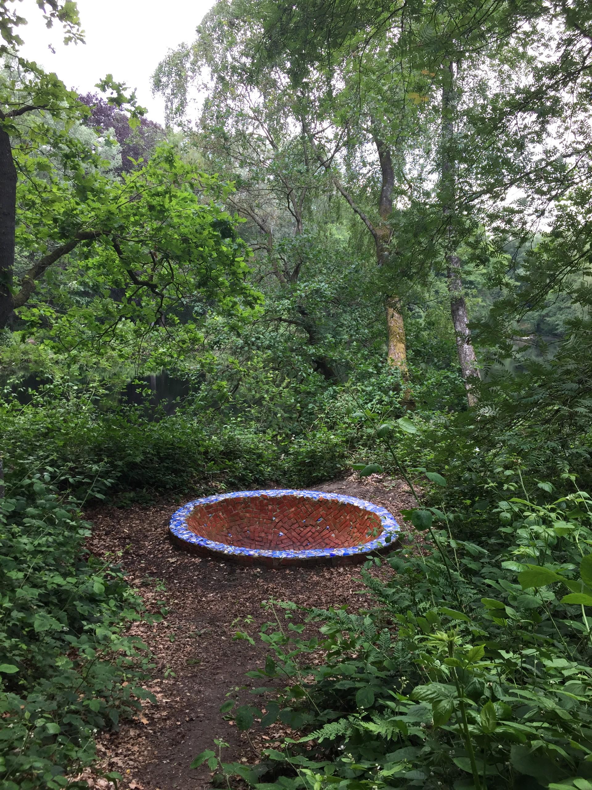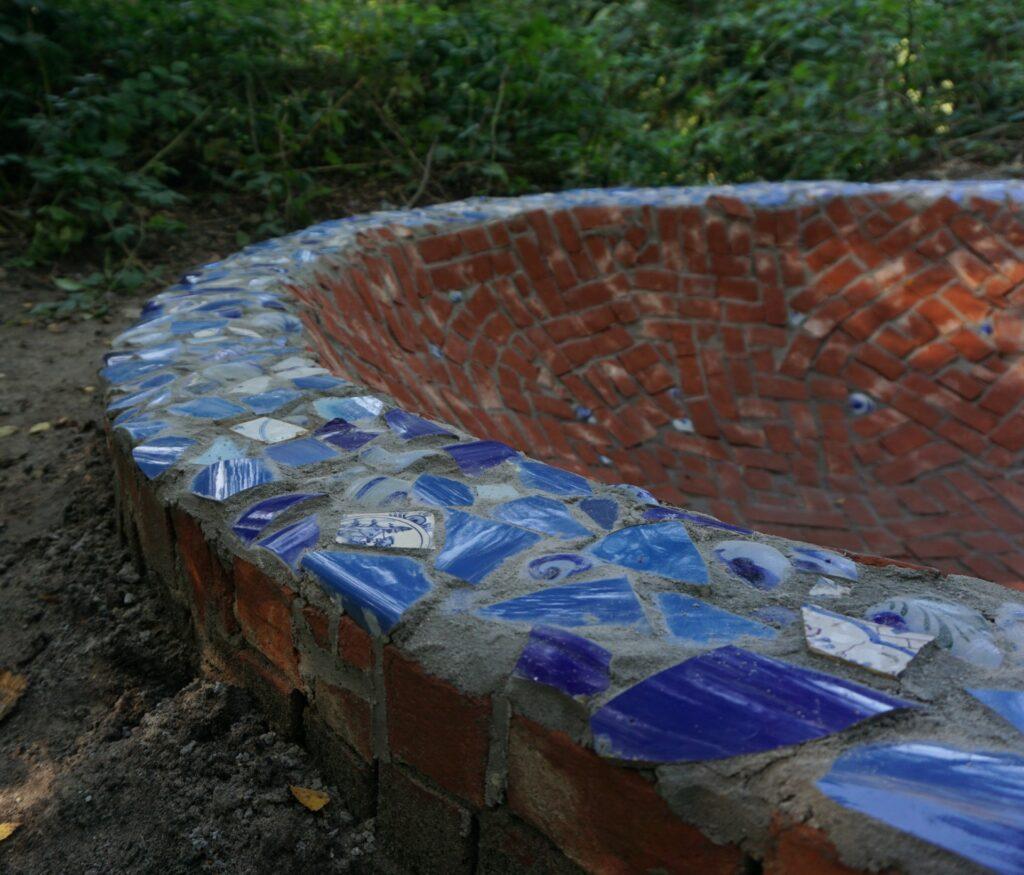 Die Umgebung von Lonneker ist bekannt für die Herstellung von Backstein aus lokalem Lehm. Schon vor Jahrhunderten wurden Lehmgruben gegraben, aus deren Lehm Steine geformt und gebacken wurden. Dieses Kunstwerk markiert einen Ort in der Landschaft, der auf diese Geschichte verweist. Neben einer dieser ehemaligen Lehmgruben, jetzt ein Weiher, ist eine rote „Schüssel“ im Boden versunken. Der Rand steht etwas über den Boden hinaus. Die Innenseite der Schüssel ist mit einem Mosaik aus Backstein bedeckt, und der Rand mit Keramikstücken in verschiedenen Blautönen. Der blaue Kreis verweist auf den Himmel und den Kreislauf zwischen Luft, Erde und Feuer, die im traditionellen Backstein zusammenkommen. Das Werk bildet sowohl einen Ruhepunkt in der Landschaft als auch einen Ort, in dem Menschen tatsächlich Platz nehmen können, so dass sie sich im wahrsten Sinn des Wortes in die Landschaft hineinbegeben. Ohne nasse Füße zu bekommen, denn im Boden des Werkes befindet sich ein Abfluss, der das Regenwasser in den nächsten Graben abführt.